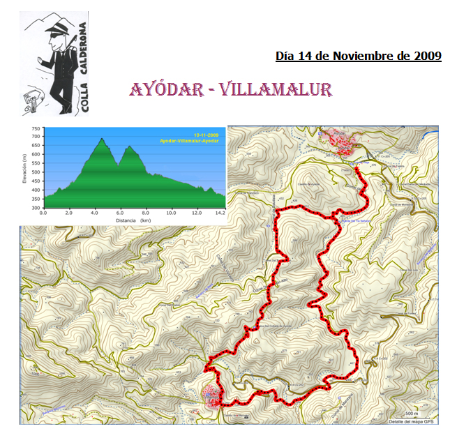 A las 9:45 a la altura de un pequeño maset, nuevo, con puerta metálica, parada 5’. 100 m después salimos a una pista ancha que seguimos en recto. A las 9:53, cruce con poste de señales del PR V-276; tomamos a izquierda dirección “VILLAMALUR: 4 KM 1 H-20’. Pronto, desecha un carril que sale a derecha; volvemos a cruzar la rambla y a las 10:05, dejamos la pista por una senda que arranca a izquierda con las señales del PR. (5’ y se queda Enric, que no se encuentra muy bien) Algunas marcas de pintura no están muy claras, aunque pequeñas fitas, también señalan el itinerario, y éstas no se borran.