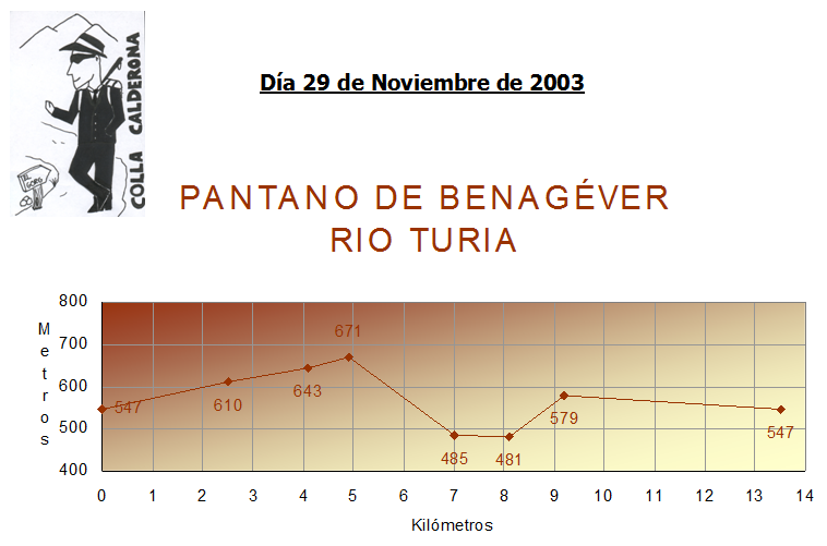 El camino, subiendo poco a poco. A las 11.10 h, cruzamos la rambla. Cinco minutos después, llevamos 4,1 km recorridos, y estamos a 643 m/a; continuamos por el GR. En el km 4,9, a 671 m/a, 11,30 h, giramos a la izquierda siguiendo las señales, ¡ojo¡, dejando el camino por una senda, y apenas 50 m después, volvemos al camino y hacemos izquierda. Enseguida viene un campo cultivado, que cruzamos por la orilla –la señal de GR está en un almendro-. Del campo salimos a camino, donde hay un poste indicador; tomamos a la derecha, con dirección a Ermita de Benagéver. (Este camino es parte del recorrido de la presa a Chelva) Enseguida se convierte en senda, en fuerte descenso.