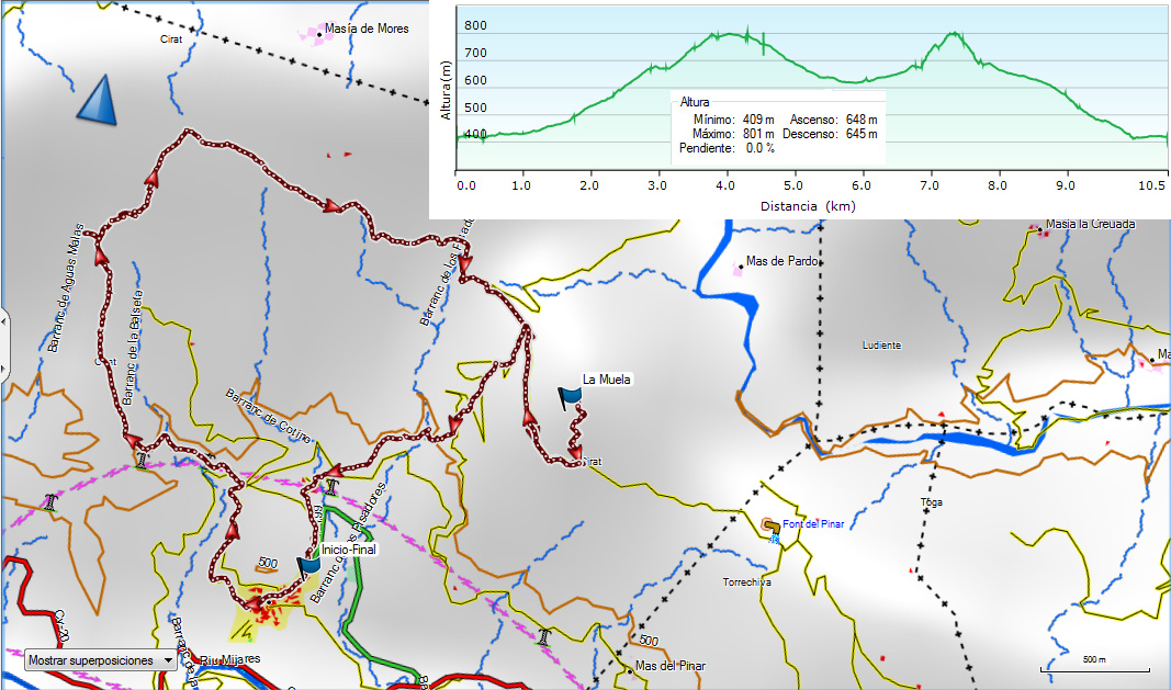 Comprobado que estamos todos, a las 9:02 iniciamos la marcha, atravesando el pueblo hasta la parte opuesta, saliendo del mismo por camino hormigonado. A las 9:20, llegamos a un cruce múltiple, con un pequeño maset a la derecha. Cruzamos el camino y tomamos una senda a la izquierda; un poste de señales de sendero local (verde-blancas) indica dirección a Cirat.
