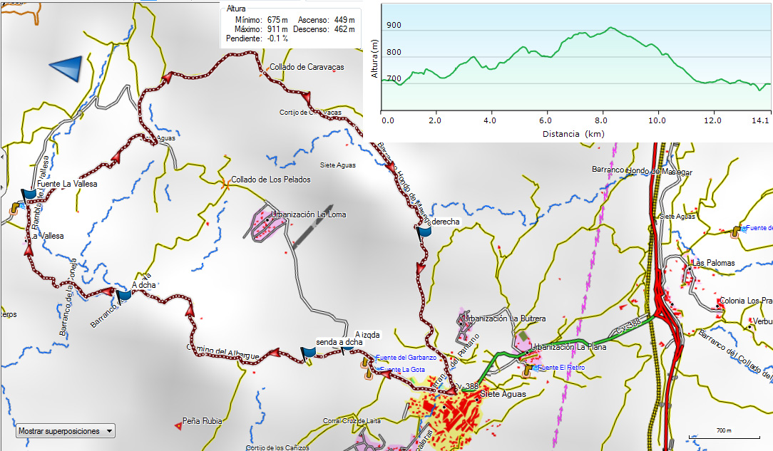 Iniciamos la marcha a las 9:02, a 711 m/a, siguiendo por la misma calle Fte. de la Gota, pasando poco después, por delante del cementerio, que queda a la derecha, y de la fuente del Garbanzo, a la izquierda. Enseguida, también a izquierda la entrada a la fuente de La Gota.