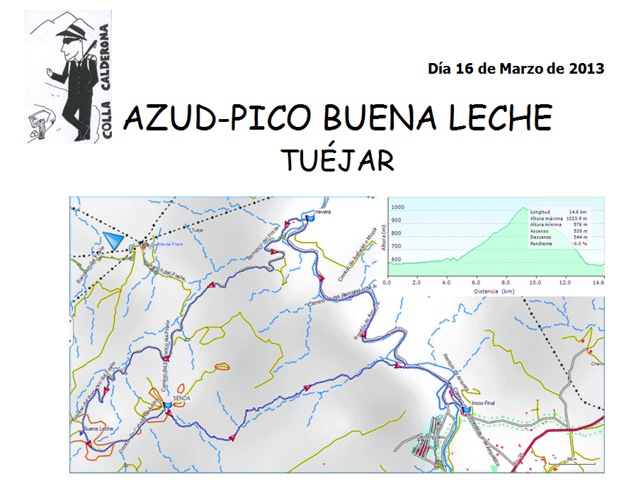 Después de aparcar en el parking del Azud de Tuéjar, iniciamos la marcha a las 9:10 h a 590 m/a, por el camino de la Rambla de Arquela, río arriba.